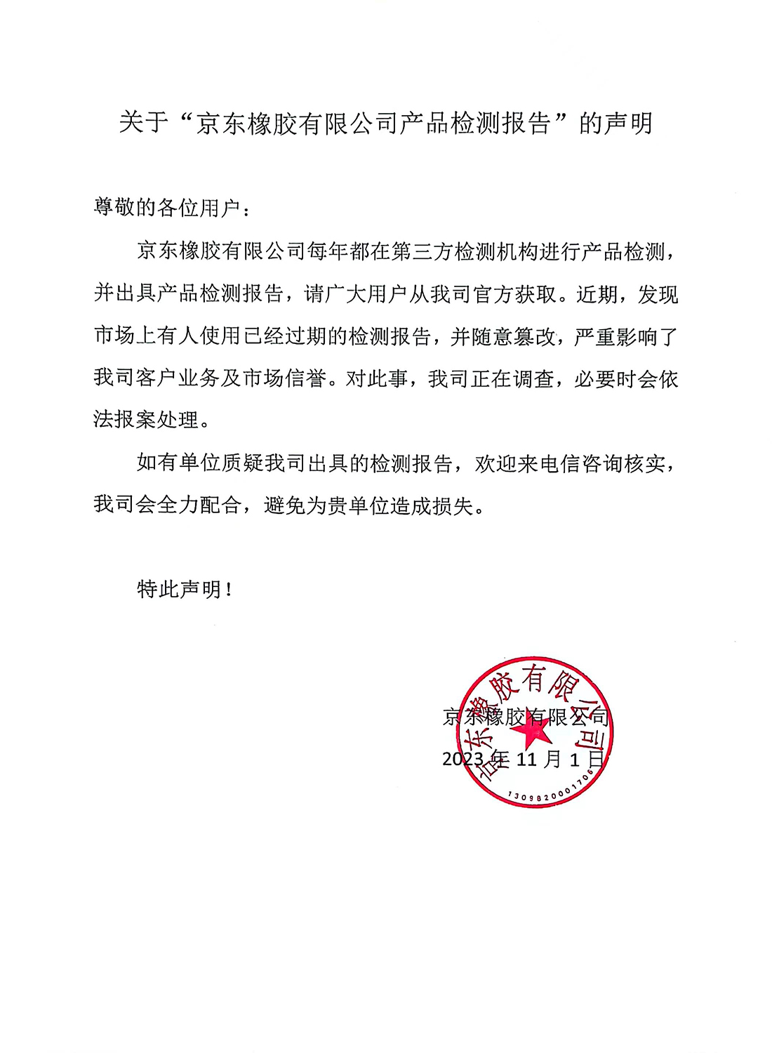 關于“京東橡膠有限公司產(chǎn)品檢測報告”聲明